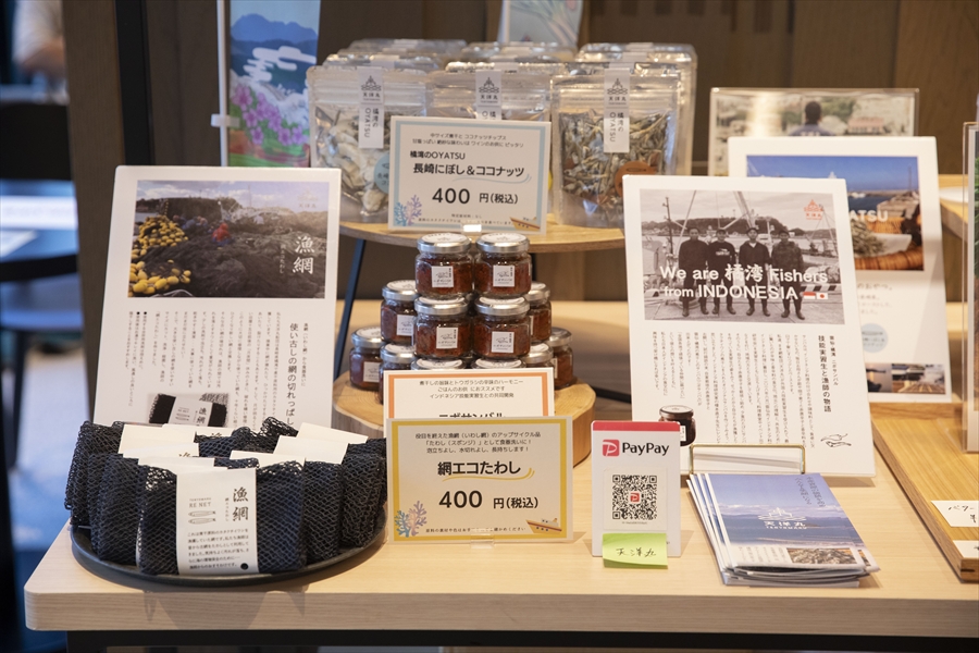 竹下さんは、祖父から受け継いだ「天洋丸」を持続可能なものにするために、「水産資源の価値を高め、みんなと笑顔になる」というモットーを掲げ、10年ほど前に法人化。イワシ漁だけに頼らず、タコ・イカ漁、サバ・サーモン・岩ガキの養殖など幅広く挑戦していると言います。また、廃棄していた網を再利用し、駄菓子を入れる袋や食器用の「網エコたわし」として商品化しているそう。「網エコたわしは普通のスポンジよりもすぐに乾き、少量の洗剤でも汚れ落ちがすごくいい。漁で使う網なので耐久性抜群で、半永久的に使えますのでコストパフォーマンスも高いですよ」