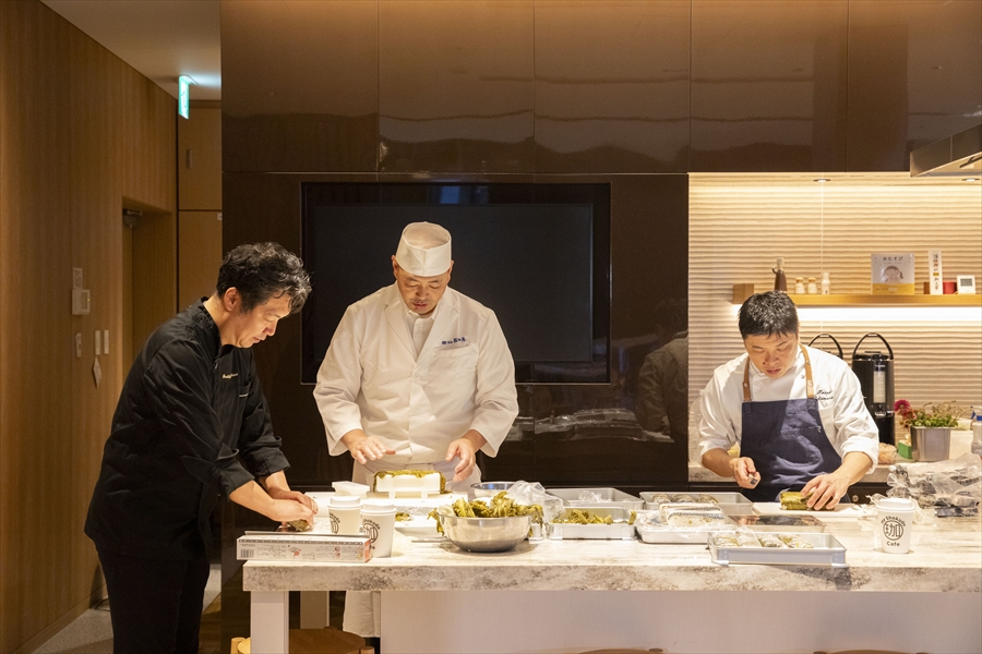 当日キッチンに立ったのは、昨年「食のFIELD WORK in 雲仙」を通じて現地を訪れた「丸の内シェフズクラブ」のメンバー3名。加えて、雲仙に店を構える2名のシェフ・料理人にもお越しいただきました。全5名が雲仙の食材を活かした料理を1品ずつつくり、全5品のプチコースに仕上げていきます。