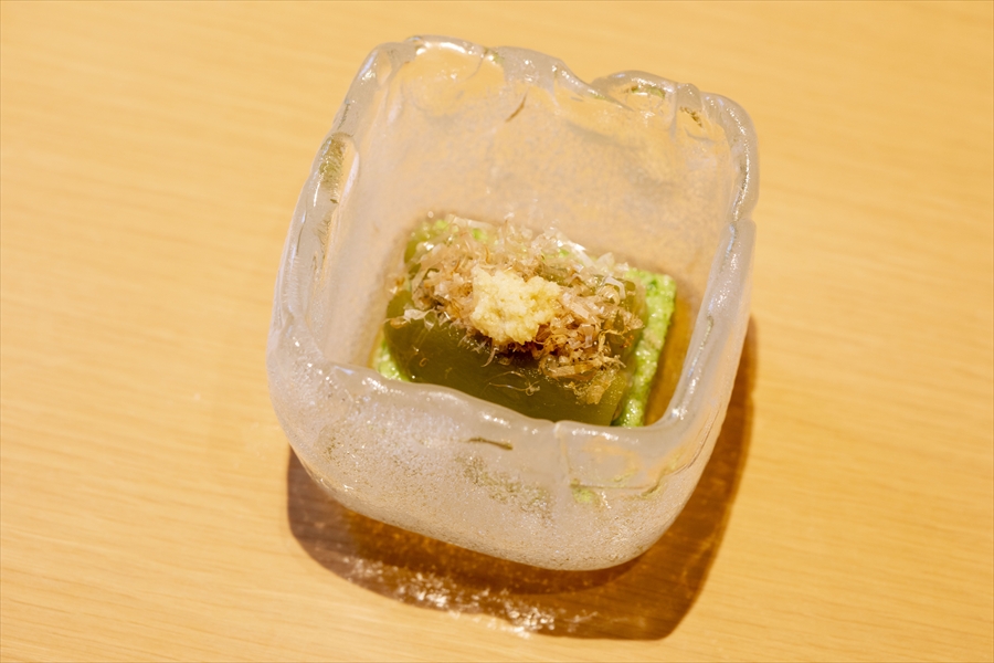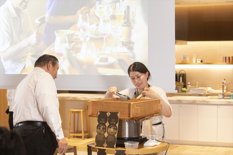 中村さんは「オクラの食感をぜひ楽しんでほしい」とコメント。東京で手に入るものと品種は同じでも、雲仙産オクラは驚くほど強い粘りが特徴で、たたくと包丁にまとわりつくほどだと言います。今回は他県産と雲仙産の同品種のオクラを二層に仕立て、その違いを一皿の中で味わえるよう工夫しました。また、「雲仙ふわとろ緑なす」も塩や醤油の最小限の味付けで甘みが際立ち、大地が育んだ素材の力を感じさせる一皿となりました。