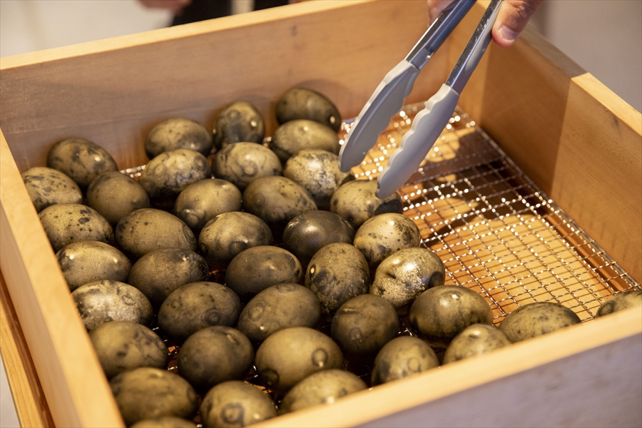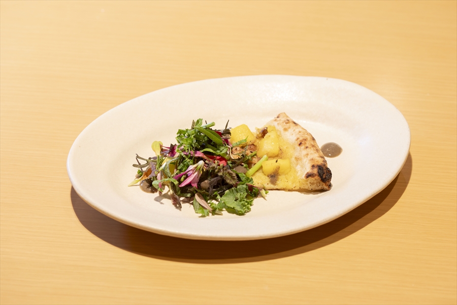岩澤さんは「土と海と発酵を一皿に表現した」と紹介。煮干しの旨みを追加した希少なじゃがいも「ながさき黄金」にタコを合わせ、“日本のアンチョビ”ともいえる天洋丸の「エタリの塩辛」にビネガーを効かせたソースを添えています。さらに雲仙で見たジャガイモ畑の絶景をイメージし、東京の畑で育てた花やハーブで彩りました。