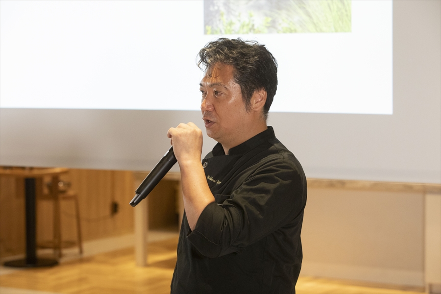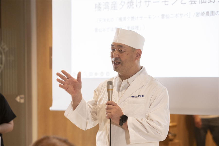 「雲仙市は大自然の恩恵を受けた“食材の宝庫”。昨年初開催された『2024年 美食都市アワード』でも、受賞した全国5都市のひとつに選ばれました。受賞した理由の1つは、在来種の野菜や伝統食材が豊富にあること。そして、料理人も市民も、地元食材の魅力を深く理解し、積極的に活用していることがあります。また、地元の新鮮な食材を味わえる・購入できる環境も十分備わっています。あと、生産者の方々の“雲仙愛”がとても強いですよね(笑)。今日、会場にお越しいただいている『雲仙つむら農園』さんも『天洋丸』さんも雲仙愛にプラスして、こだわりとプライドと情熱を持って取り組んでいらっしゃいます」