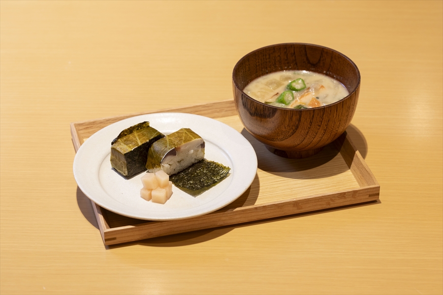 名物「長崎バッテラ」(サバの押し寿司)を「島原半島を丸ごと味わう一皿」に仕上げたのは、草野さん。煮干しを与えて育てた「天洋丸」のサバを使い、塩漬けした「雲仙こぶ高菜」の葉で巻いたバッテラに、有明のりを合わせました。シャリには、雲仙こぶ高菜の茎と根の方にあるコブを刻み、ゴマ油と醤油で炒めて混ぜています。粕汁は、「天洋丸」が海上養殖している「夕焼けサーモン」のあらで出汁をとり、地元『あい娘酒造』の酒粕と麦味噌を使用。さらに、雲仙ではレジェンド的な有機農家・岩崎政利さんの野菜をふんだんに加えました。野菜自体の味が濃く、出汁も出るため、魚介系のスープにまろやかな味わいをもたらしています。