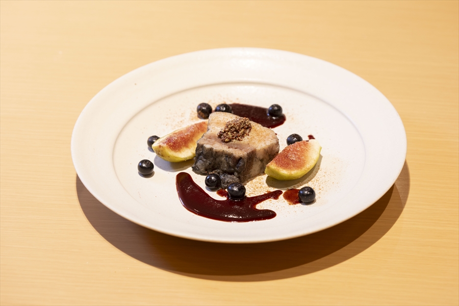 岡村さんは「雲仙らしさを表現するため、豚肉に温泉の香りをまとわせた」と言います。お米を中心に、人が食べても安全な素材を混ぜた飼料で育てた「雲仙あかね豚」を源泉で約2時間かけ流すという調理法に初挑戦。そこに、地元産のブルーベリーやイチジクを合わせています。ソースはバターを使わずに豚のエキスで濃厚に仕上げ、雲仙市の伝統野菜「雲仙こぶ高菜」の種を使った自家製マスタードを添えました。