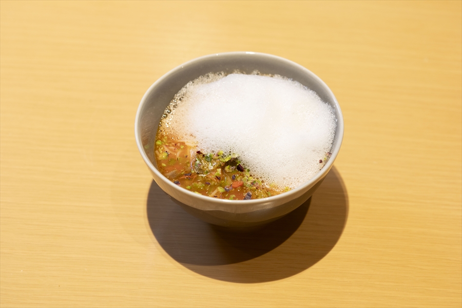 雲仙温泉を代表する観光名所「雲仙地獄」の風景を表現したのは、永島さん。雲仙市の温泉水で茹でた「雲仙クラフト素麺」に、温泉水で仕立てたトマトの泡スープを重ねています。さらに、天洋丸の「二ボサンバル」、発酵させたピーマン、雲仙つむら農園の4種の唐辛子を揚げたものなどを組み合わせ、温泉がふわりと香る独創的な一品が完成しました。